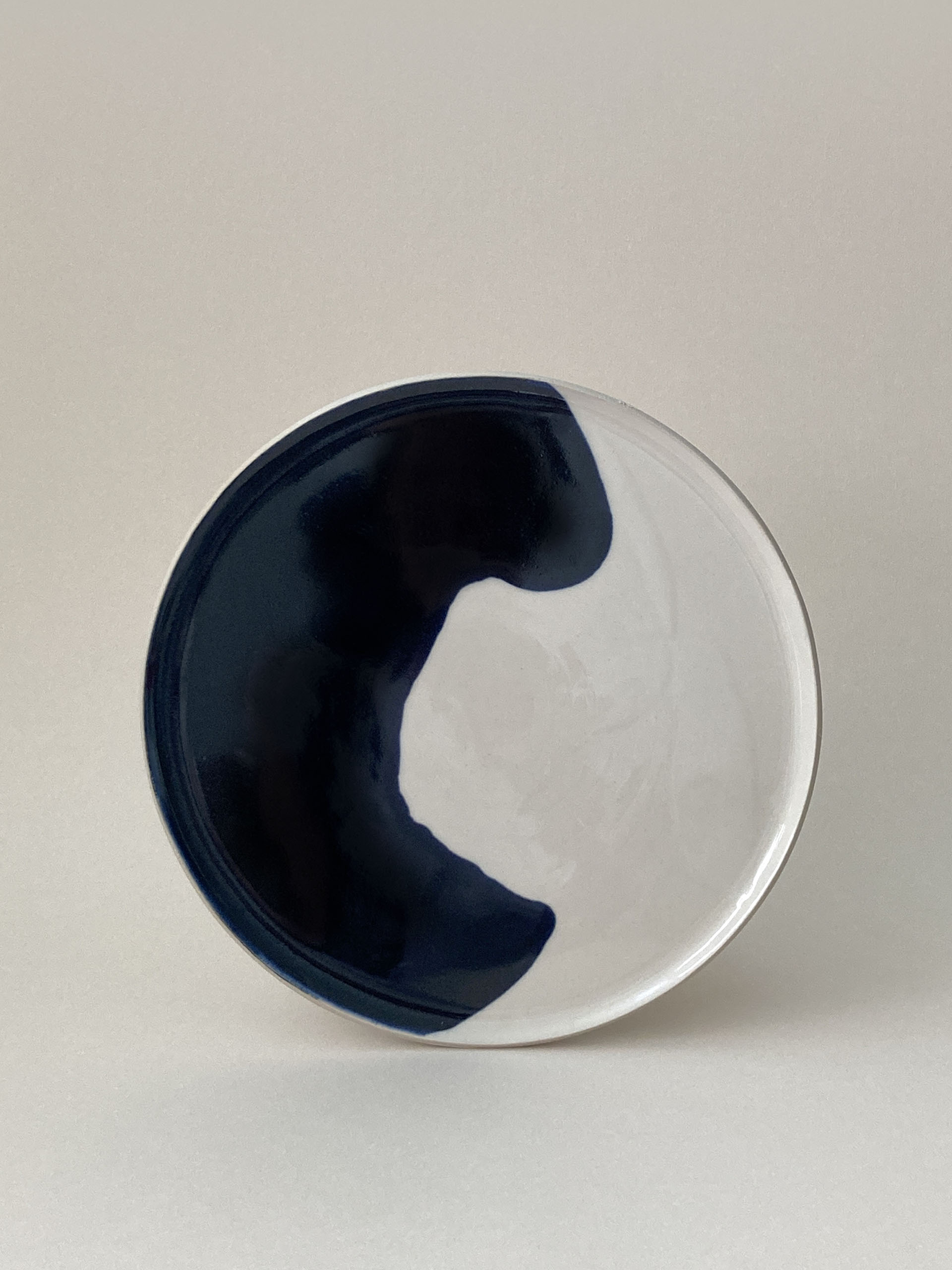 Grande assiette décorative plate avec une large forme de bleu dessinant un tableau libre coloré. Réalisée à la main à la plaque et émaillée au versé, chaque pièce est unique.