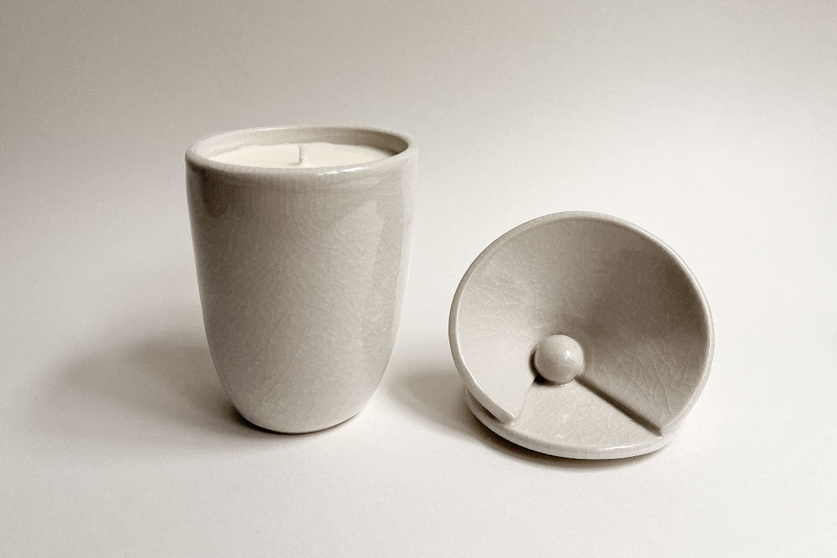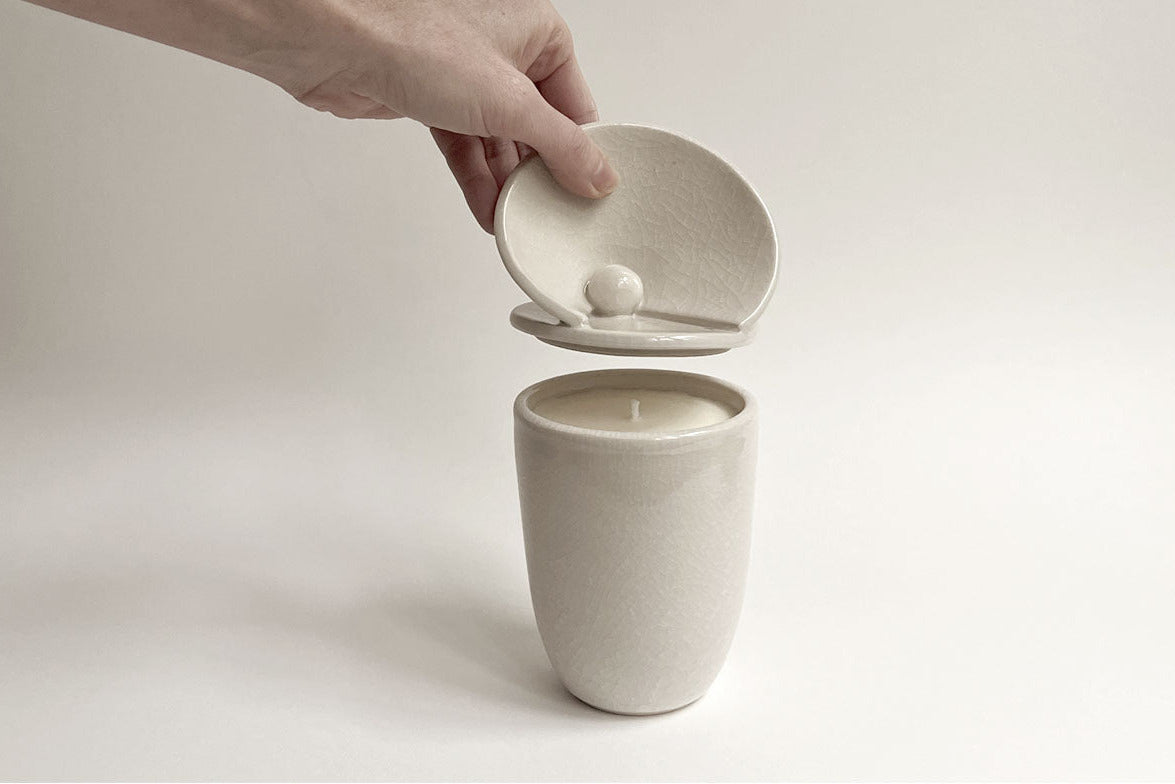 La forme sculpturale est réalisée en grès tourné, façonnée et émaillée par Clémentine Giaconia dans son atelier au cœur de Paris. Le parfum subtil et la fabrication artisanale sont réalisés dans l'atelier familial de Benoit Purrini, cirier d'art à Gréasque, en Provence.